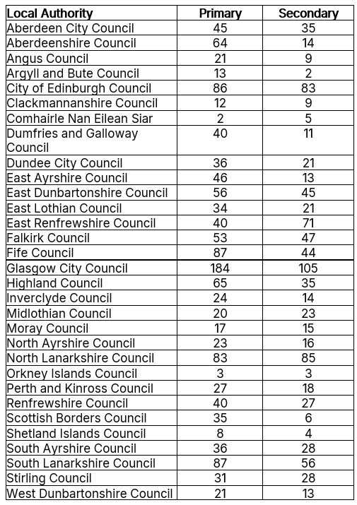 “I would be very grateful if you could supply the number of probationer teachers (those on the Teacher Induction Scheme or otherwise completing their probationary year) who started in August 2025, broken down by each local authority area in Scotland, and further separated into primary and secondary sectors.